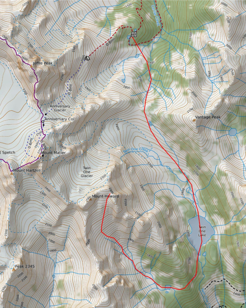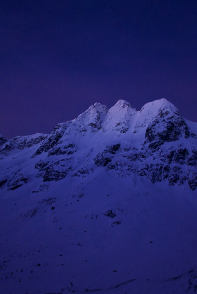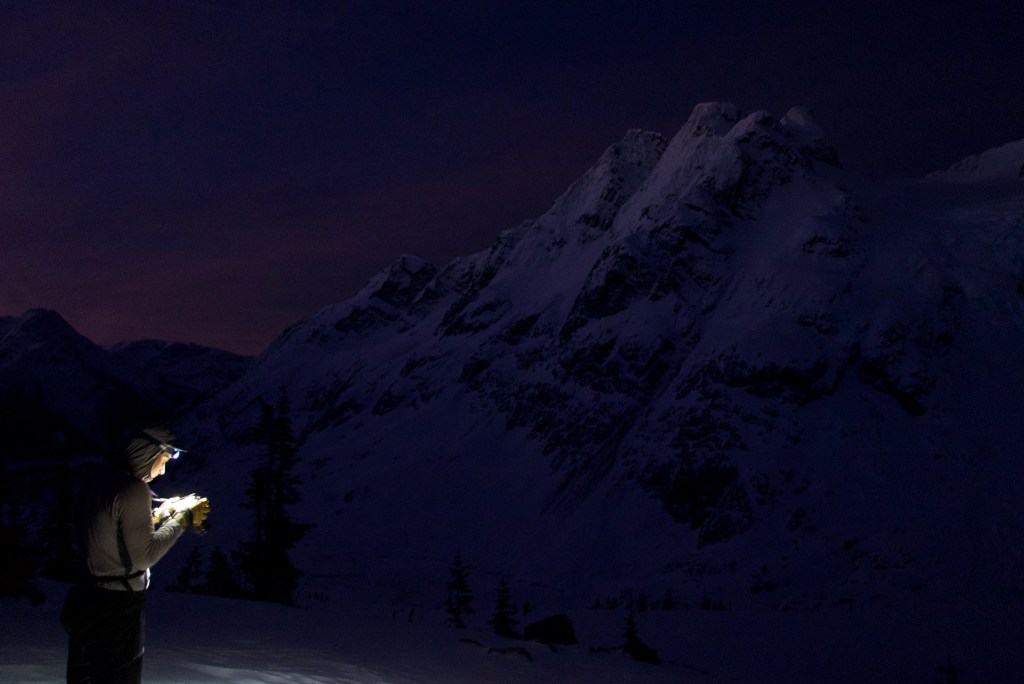 The next morning we headed off from the cabin at 5:15. Our planned route wrapped over Vantage col, down past the NE face of Mt. Howard, across Twin One Lake and back up to Mt. Howard from the south valley. Our goal was to time passing by the to view our line with the blue hour before sunrise so we could get an idea of whether the line was even in shape with the low snowpack. Our route wrapping around to the south valley was much lower exposure then booting up or heading up the complex Twin One Glacier. However it was all at the cost of a lengthy skin.