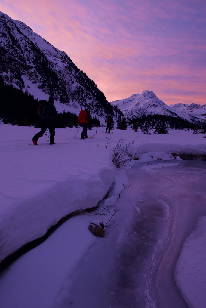 After passing by to view the face we skied down to valley bottom. We skinned along twin one creek and lake as the sun slowly rose, igniting the sky. Wrapping around into the neighbouring valley we headed back north into the and up into the alpine.