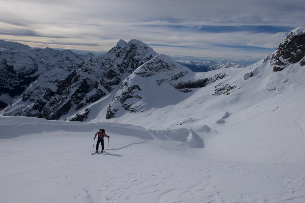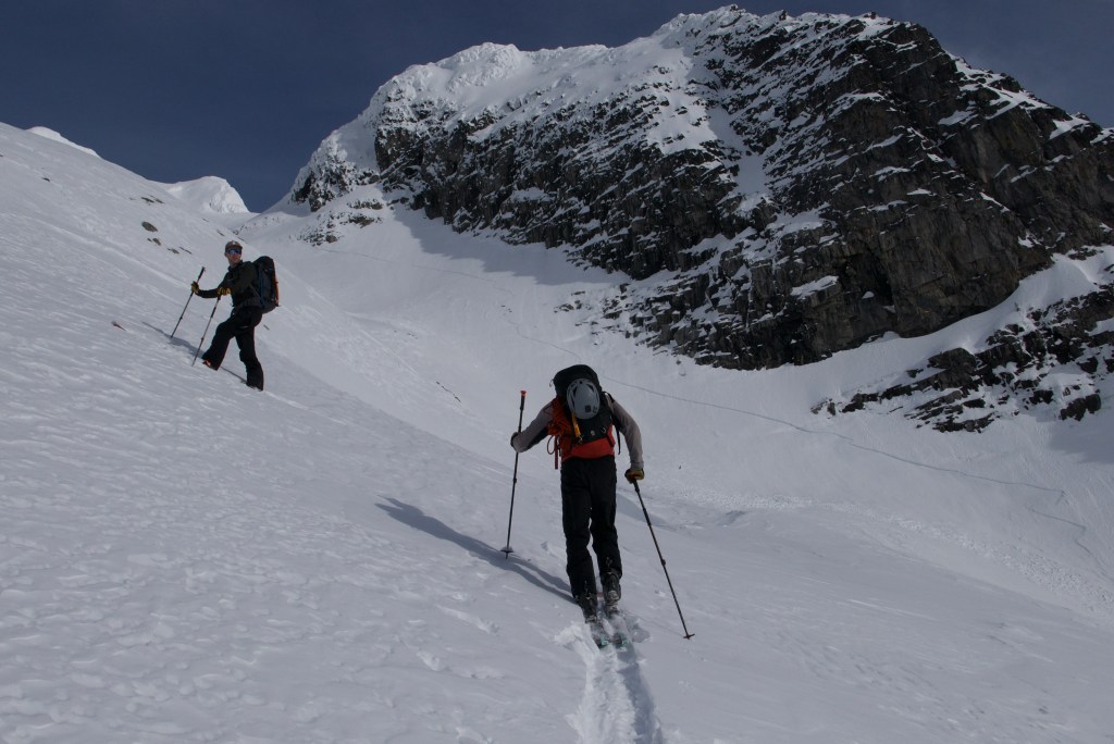 The skin up took longer than expected. The hard wind affected snow made kick turns and side hilling precarious. To save time we decided to skip the summit and head straight to our primary goal of skiing the couloir. We could see three notches side by side, all of which looked like they could hold the door to our line. A debate ensued, I was almost ready to put money on the left notch, but Ryan was 100% on the far right notch. His confidence was far more than mine and he persuaded the rest of us in heading directly to the correct notch.