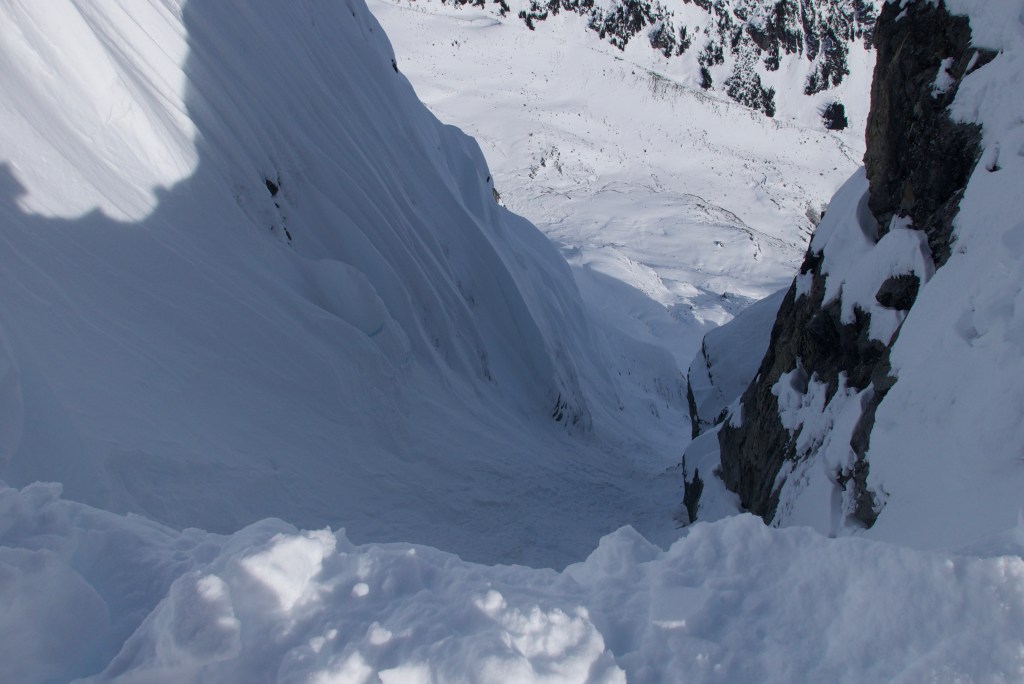 Getting to the notch, we donned our harnesses. I stabbed in my skis as an anchor and belayed myself to the edge. Probing I found where cornice overhung. I sawed and shovelled a refrigerator sized block down into the line. Clearing out the couloir and our path in. Darrion broke off another piece next to mine. We set to digging a large snow bollard which would serve as our rappel anchor into the line. I backed up the snow bollard with my skis as the others rappelled over the cornice into the line.