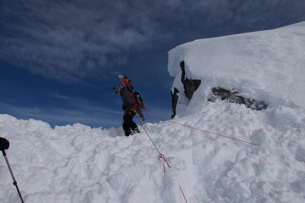 Thankfully we had decided to leave our ropes up until we had confirmed that it skied. I ascended our double ropes with my prusik and guide mode device. I tentatively squirmed my way over the lip with my ice axe, not wanting to bounce on the snow bollard. I backed up the bollard once again with my skis and set to getting everyone else up. Since it was so awkward ascending over the lip I figured it would be fastest and easiest to belay everyone as high as they could climb then haul them up the rest. Luckily we brought a few pulleys with us to make an efficient 3:1.