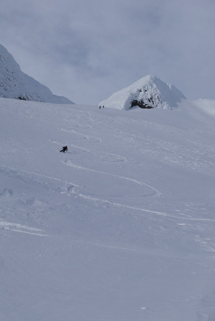 The Big Howie couloir takes a proud line down the NE face of Mt. Howard. It starts at a notch in the ridge, goes down a steep couloir for about 300m then opens up onto a small pocket glacier before making it’s way through a series of cliff bands for a total of 800m to valley bottom. It is a beautiful and intimidating ski line.