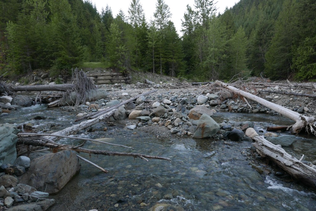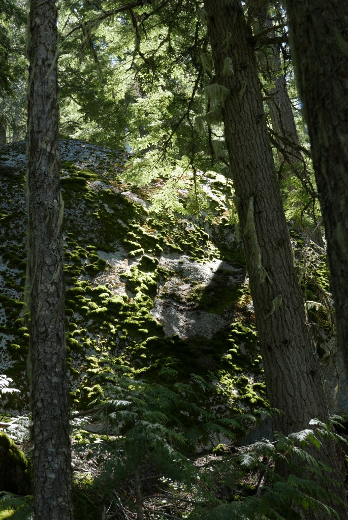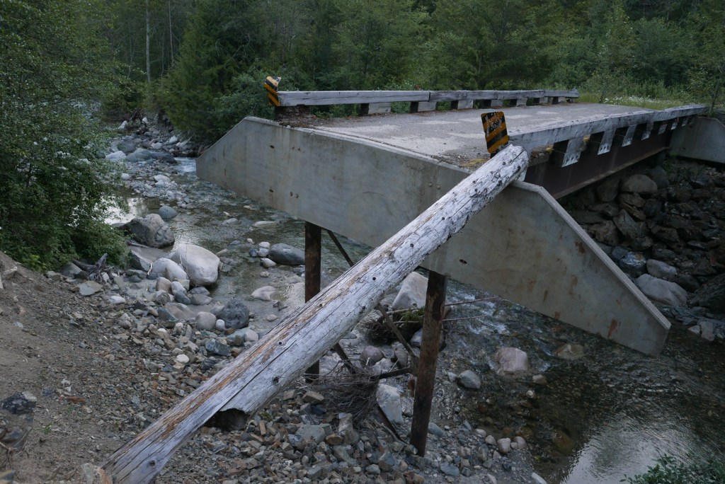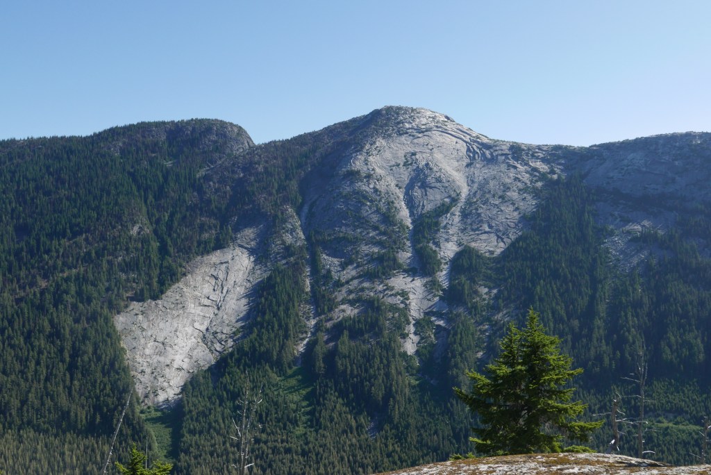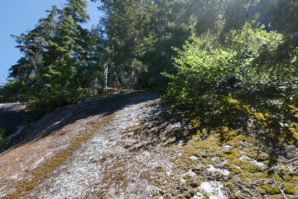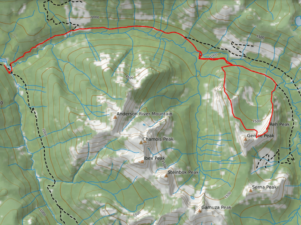 The drive up the Anderson Mainline the night before was pretty straightforward. the washouts weren’t very deep and the road was overall in pretty good shape until the big washout before the bridge. After cowboy camping next to the Land Rover, I started off the next day shortly after 5am, trying to take advantage of cooler temps in the morning for the approach. The day started off with two river crossings right off the bat. Two very well-placed logs kept my feet dry. After this the road was pretty fast travel through meadow like grasses and flowers. After about 5.5km I turned off onto a smaller road that was much more overgrown and was a classic coastal alder bash. I popped out to another easy river crossing before the road continued on the far side. My loud bush thrashing clearly spooked the Moose at the river and I just caught a glimpse of it before it rushed off ahead of me. I followed the road until I was roughly in line with the North Ridge of Reh Peak. It took me about 3 hours to this point. From here I started bushwhacking fall line up through the forest.