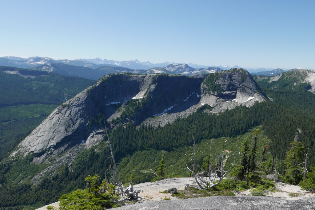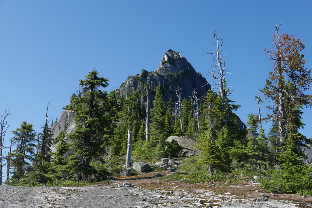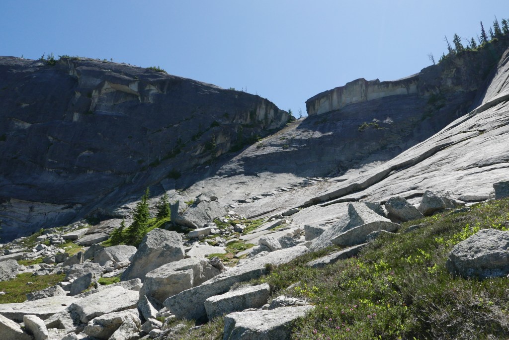 After walking down the very easy south ridge of Reh I headed over to Gemse. Initially I wanted to link up more of the peaks. Heading up Gemse I was met with dirty/crumbly 5th class friction slab cruxes and I decided that it would be better to return with a belay and I bailed back towards the Col. I headed down the col and ended up making one 10m rappel off a tree to skip a short section of down climbing.