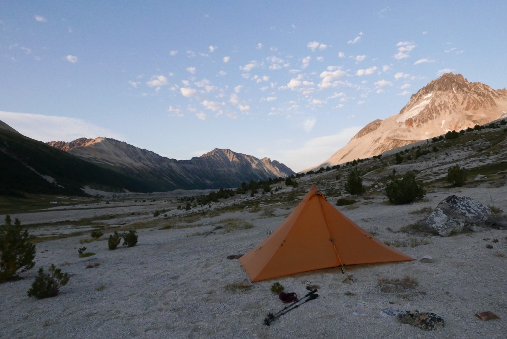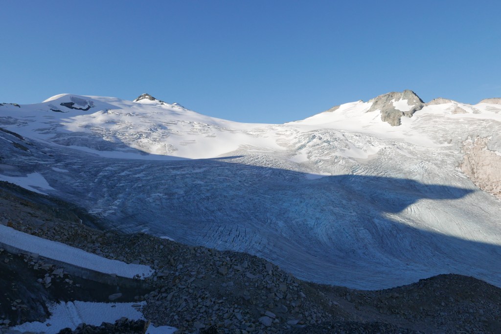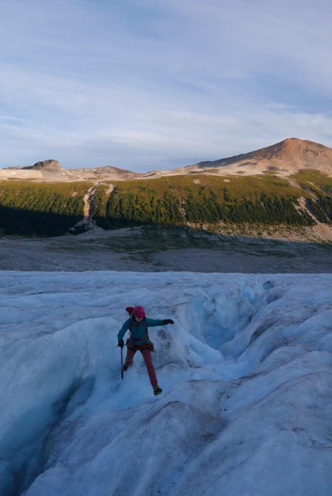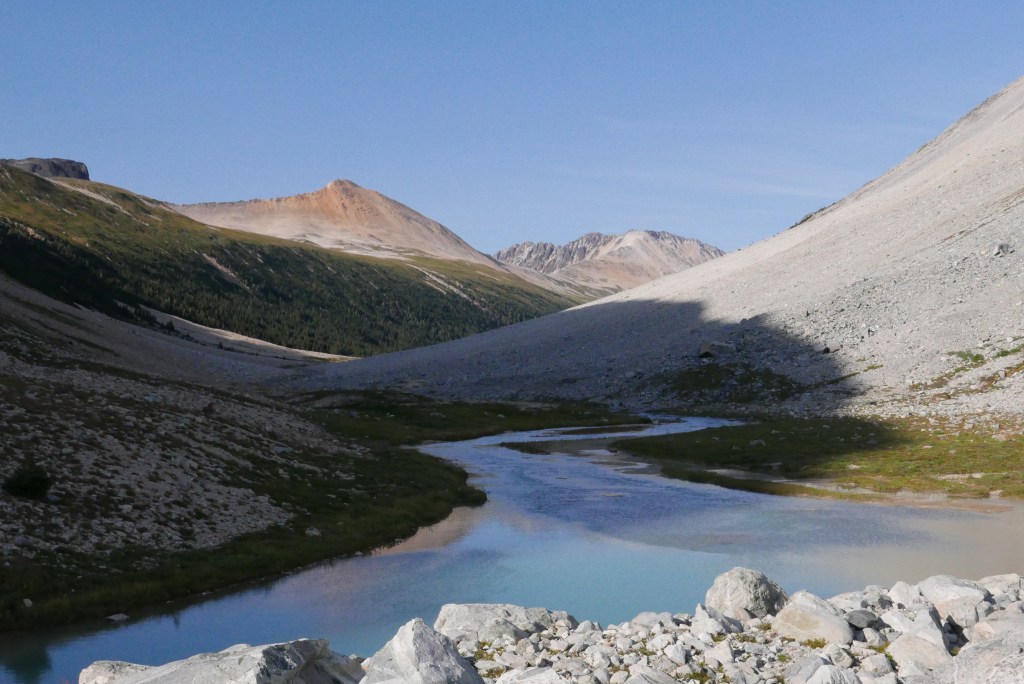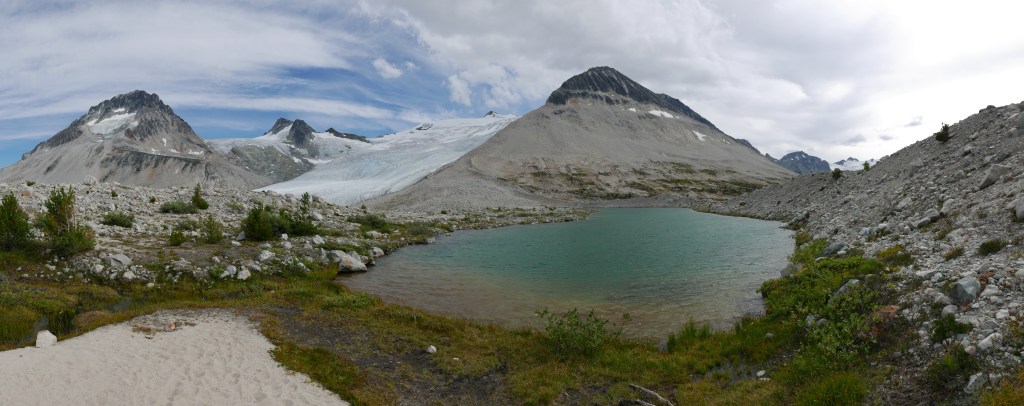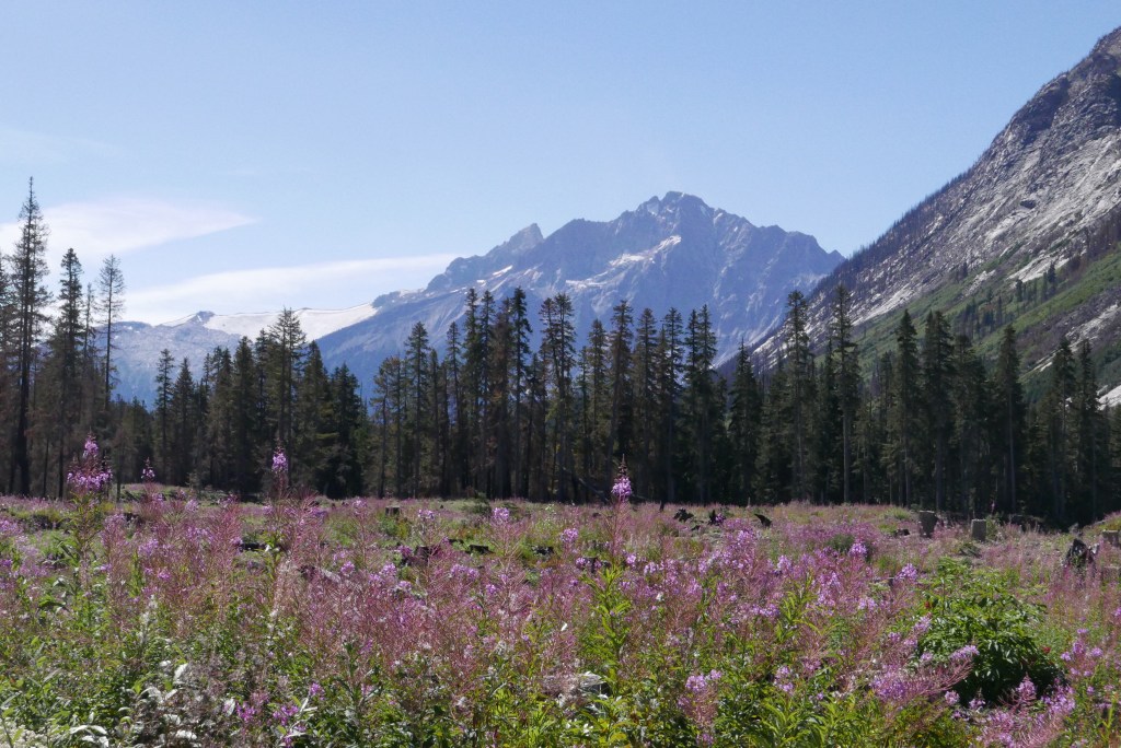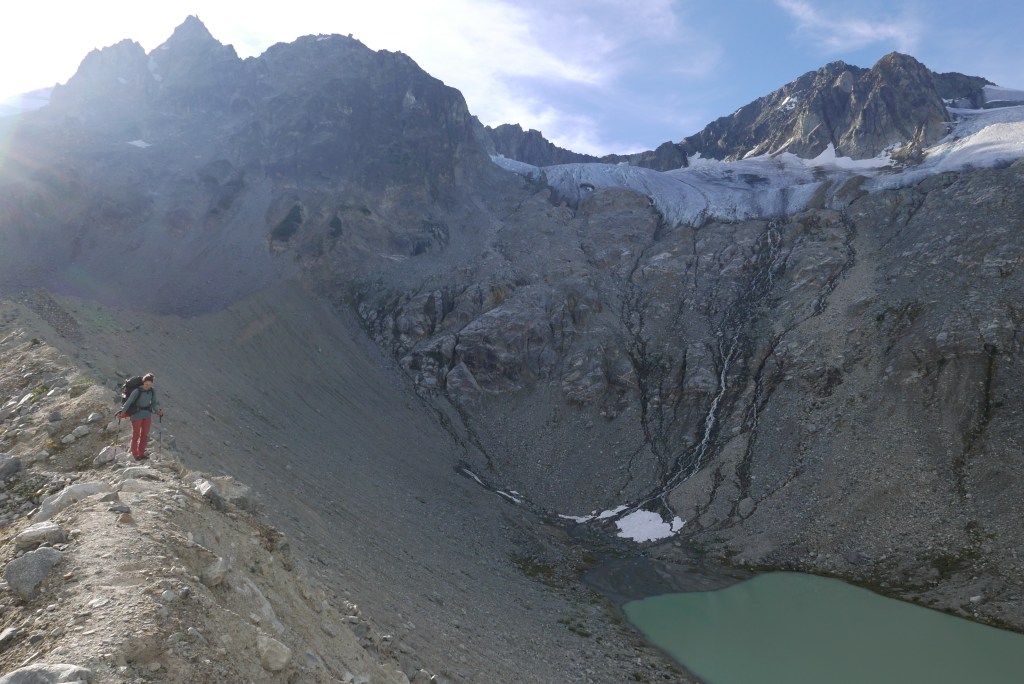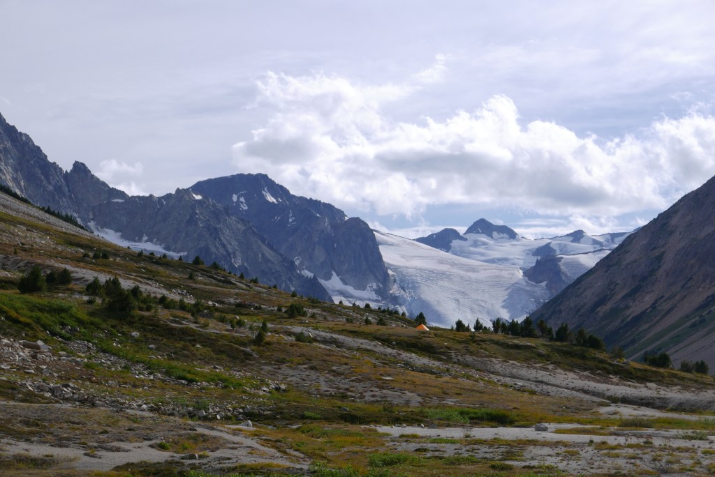 The hiking trail was in much better shape than expected. It’s a bit tricky to find the start from the burn, if in doubt just head down to Salal Creek and follow the creek up. From here there is regular flagging and cairns as you bounce between forest and riverbanks. No bushwhacking is currently required! The hike felt a bit rough in the midday heat with heavy packs, but once we made it up into the pass, the breeze and cooler air lifted our spirits quickly. We were shocked how many other parties were also camping in the pass for the long weekend. There was about 20 tents scattered throughout the valley. Fortunately, there are plenty of gorgeous and soft gravel campsites. We found one distanced from the others and settled in for the night looking up at Ethelweard.