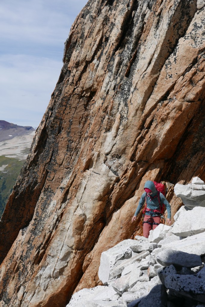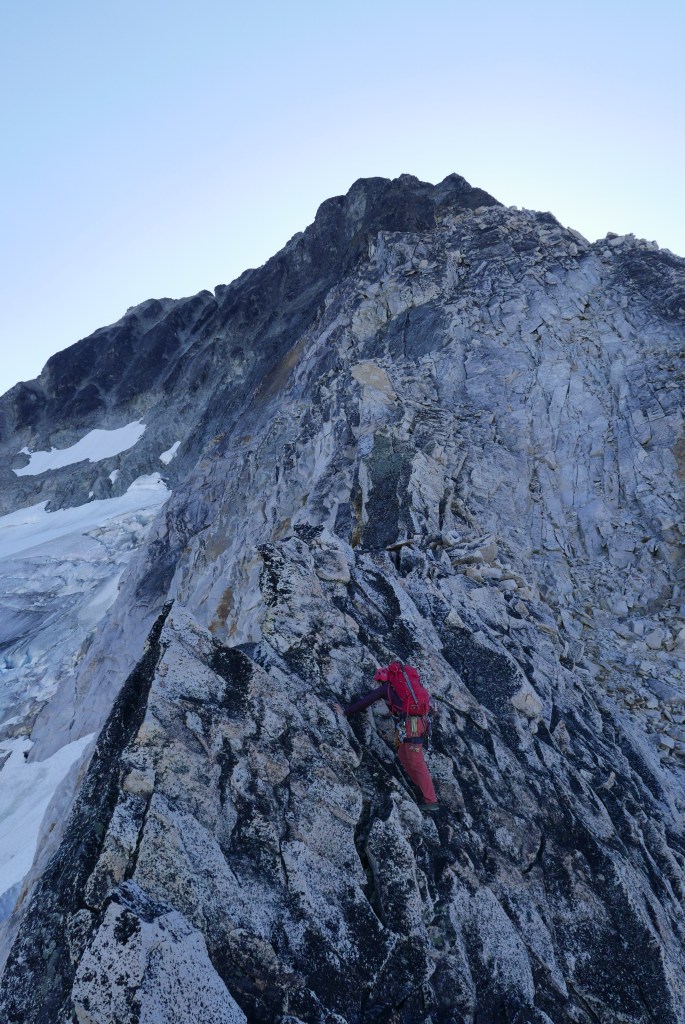 We headed up the scree slopes on the far side of the glacier aiming for a talus gulley with orange rock on climbers right. This gulley seemed to offer the easiest path to gain the ridge proper. The gulley was unfortunately a bit of a ‘house of cards’, one rock would shift under your feet and you would hear a dozen other rocks move and settle around you. We carefully either walked parallel to each other, or one at a time with the other in safe spots to manage help manage the rockfall hazard. When we first gained the ridge, the rock was still quite loose. But it quickly improved and soon we were scrambling enjoyable 3rd and 4th class moves on blocky white granite.