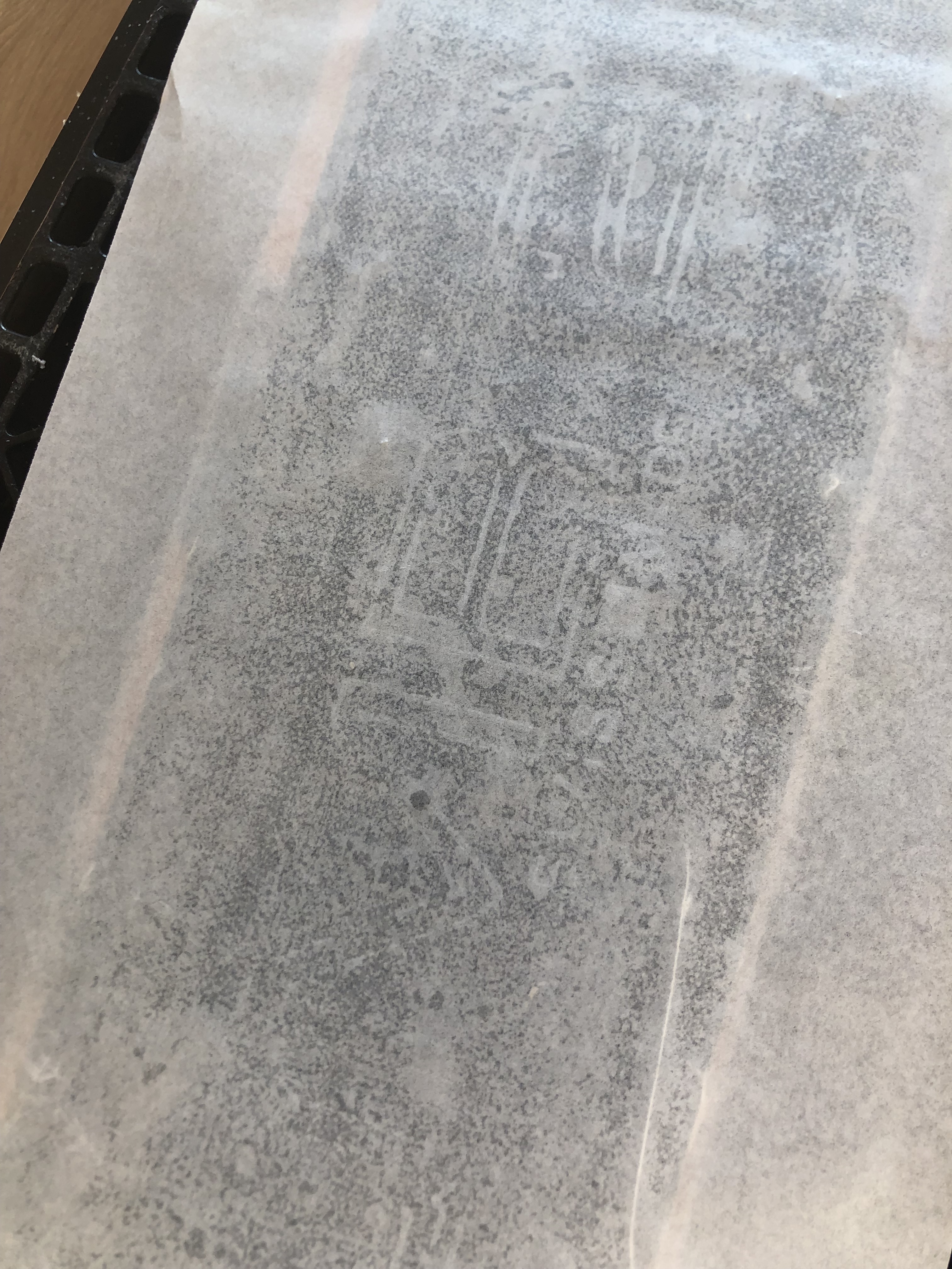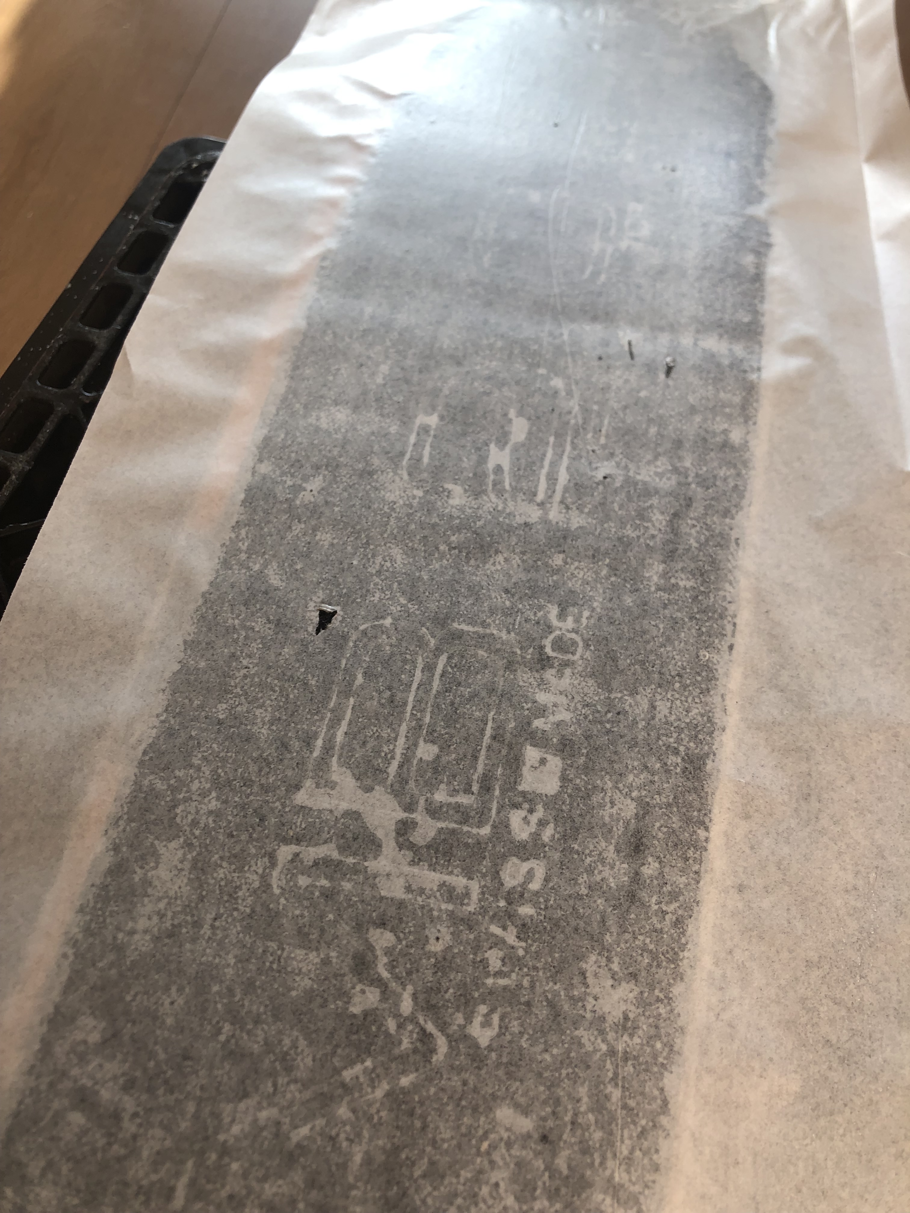 - Iron on moderate temp until glue looks to be evenly adhering to the parchment paper (see below).