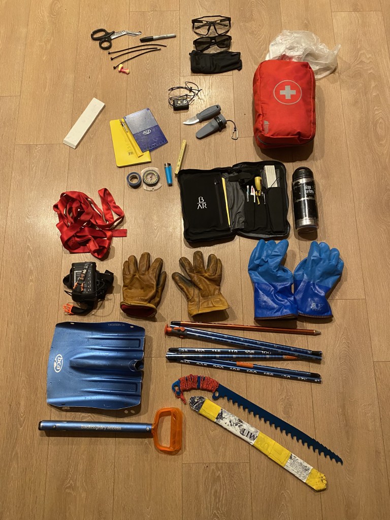 For context I work in a very wet/coastal snowpack hence the clear lenses and waterproof gloves. This is not a perfect list, but it is what I actually carry.