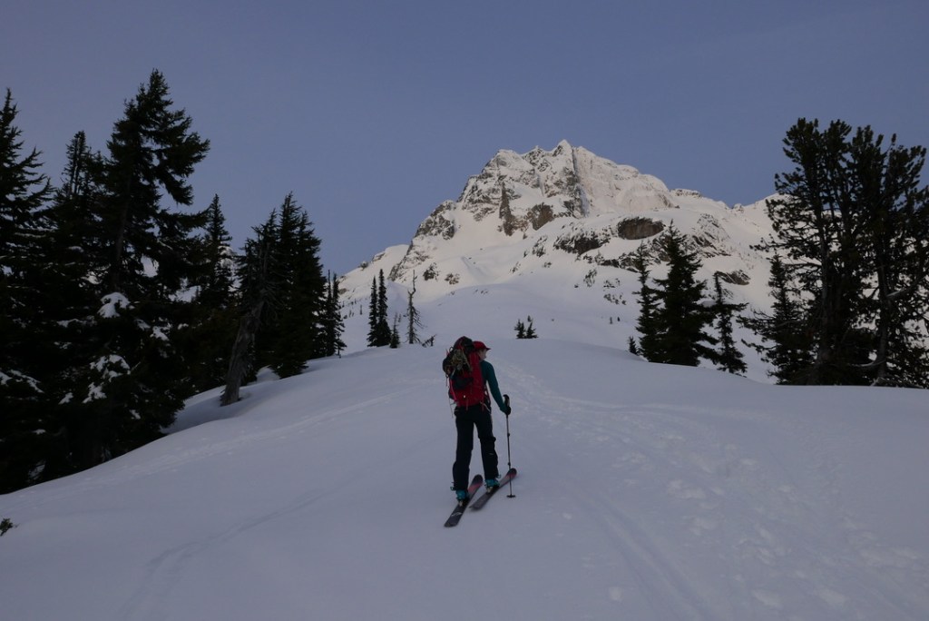 We left the hut at 0630 skinning up in the morning glow. Over anniversary col we skied down Matier Glacier to the base of the line. We donned crampons and started booting up the melt-freeze crust.