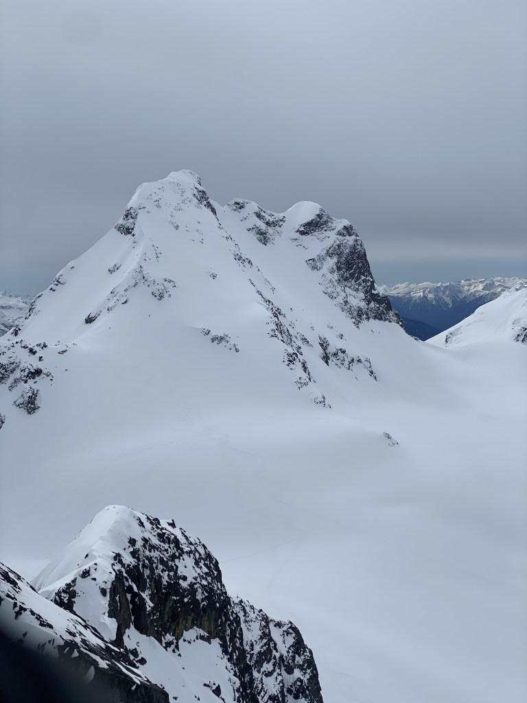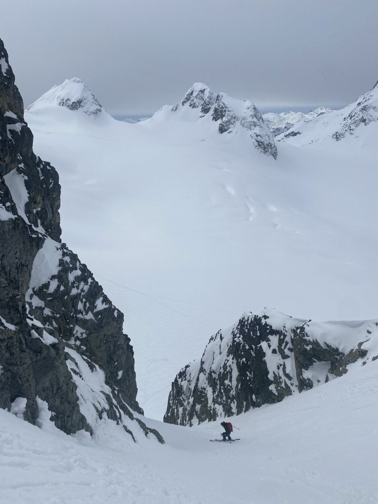 After topping out the ridge we continued up a short ways to the summit of Joffre. It was a beautiful day with high clouds. The melt freeze crust had started to soften by the time we started skiing down. It was firm, but held an edge well. Making for springy, fun jump turns.