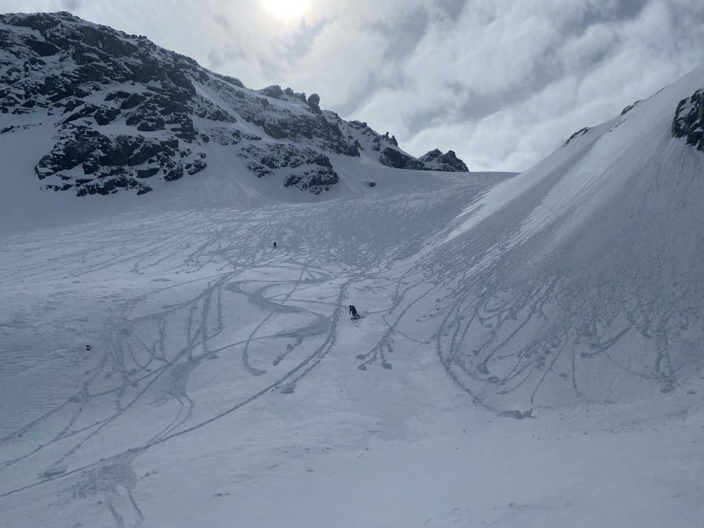 By the time we got to Anniversary Glacier the high cloud had caused a greenhouse effect cooking everything. Even sheltered north aspects were pinwheeling down onto the glacier. Thin cloud cover can have an even more drastic effect on warming than clear skies.
