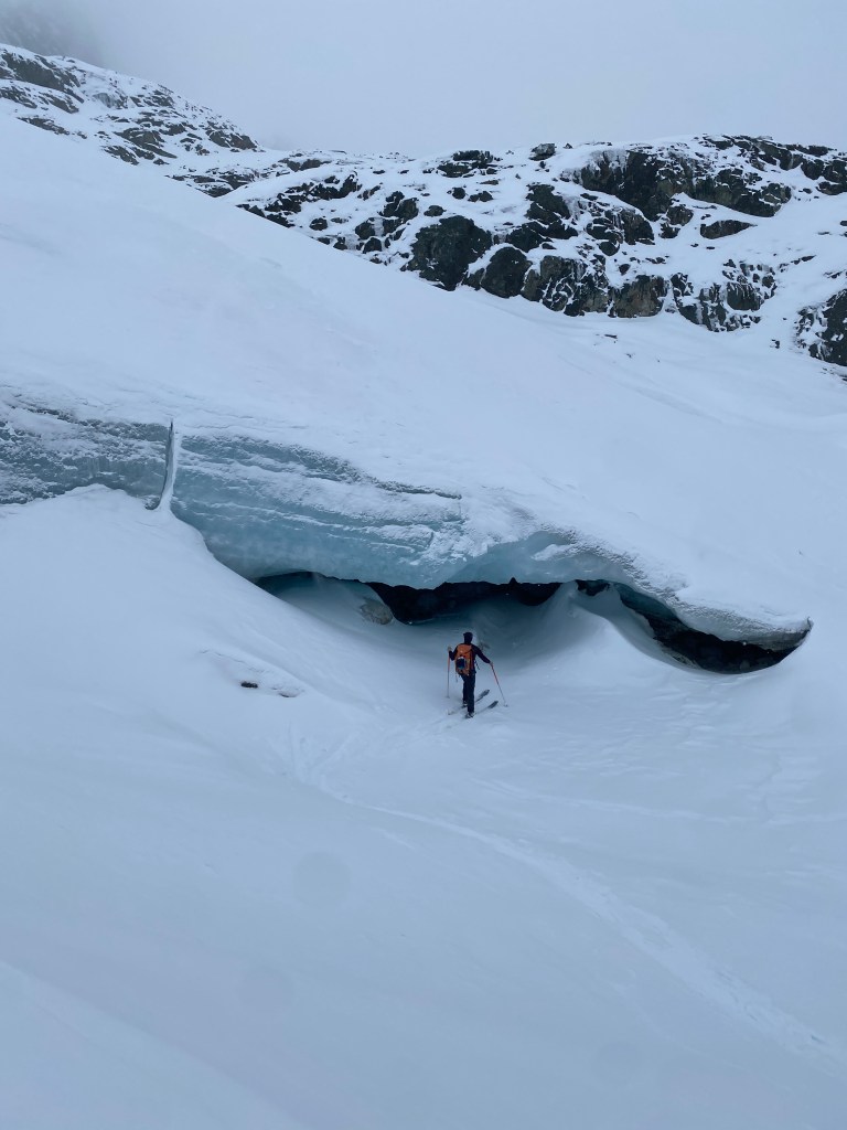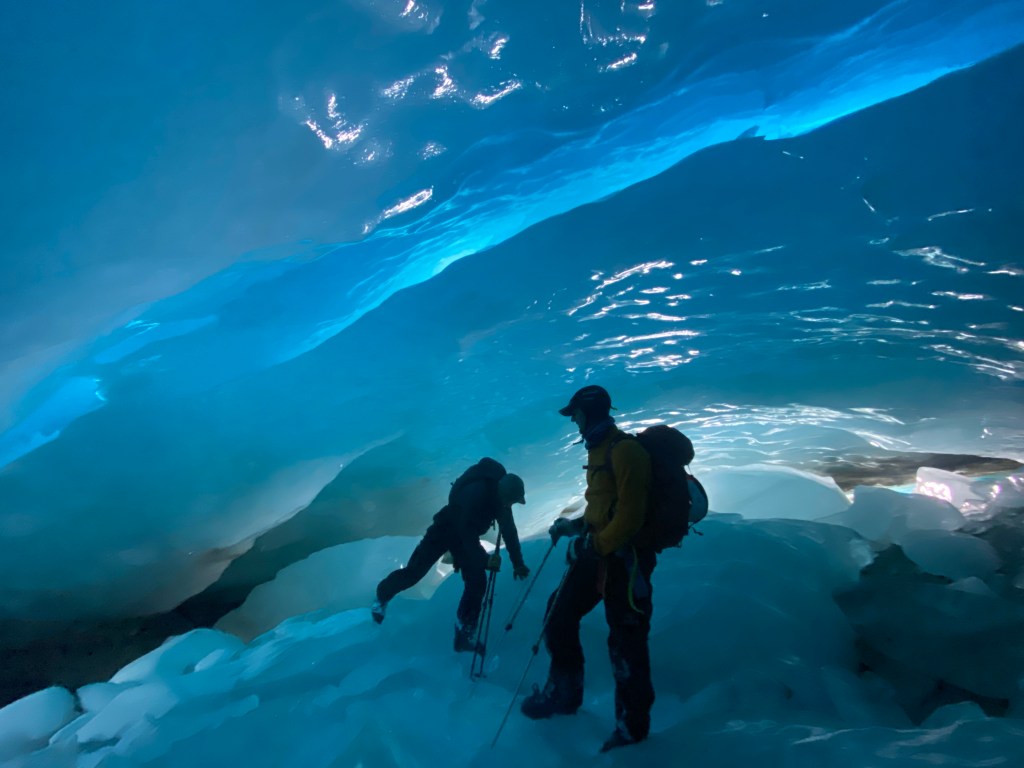 We skirted around the lake and over to the toe of wedge glacier where we explored some ice caves. Most of the ski season these will be well buried by seasonal snow, but the thin snow pack left the door to these crystalline rooms open.
