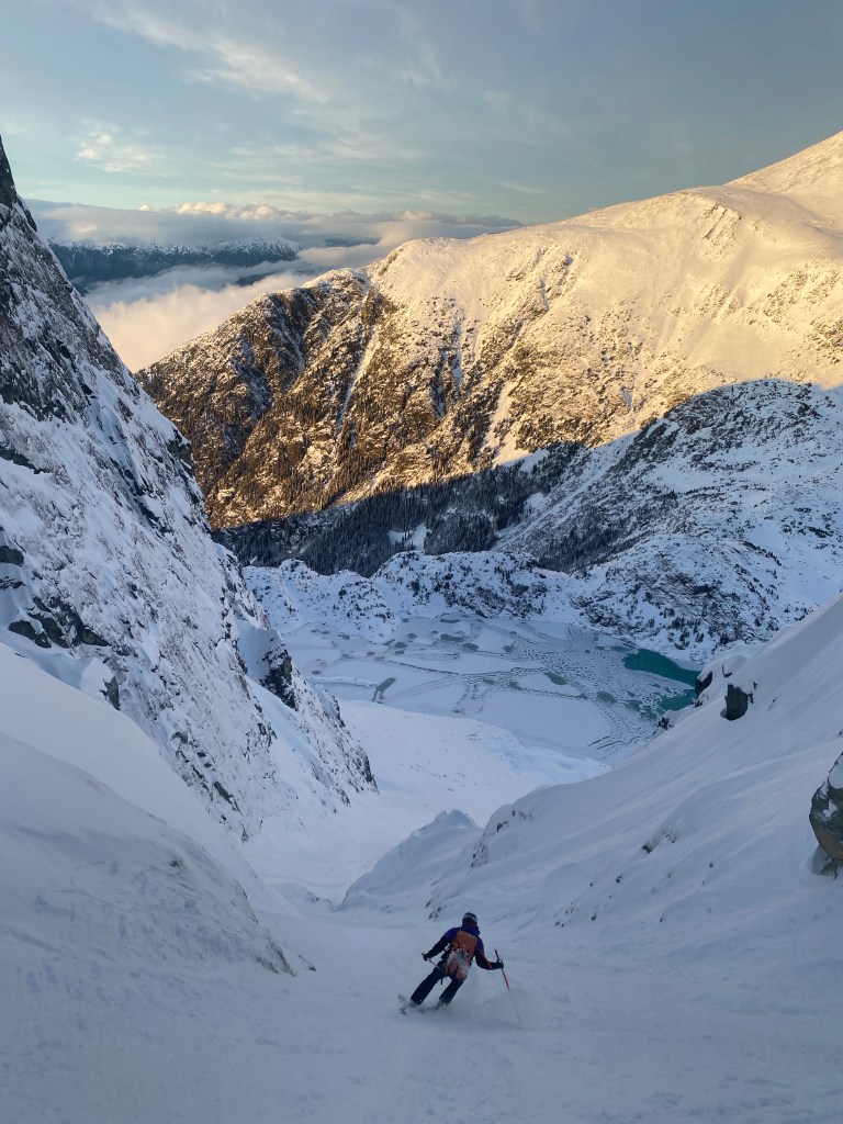 After exiting the couloir we had gorgeous sunset turns down the apron through variable wind affected snow. We traversed around to the west end of the lake for an easy river crossing and an awkward climb back towards the Wedgemount trail.