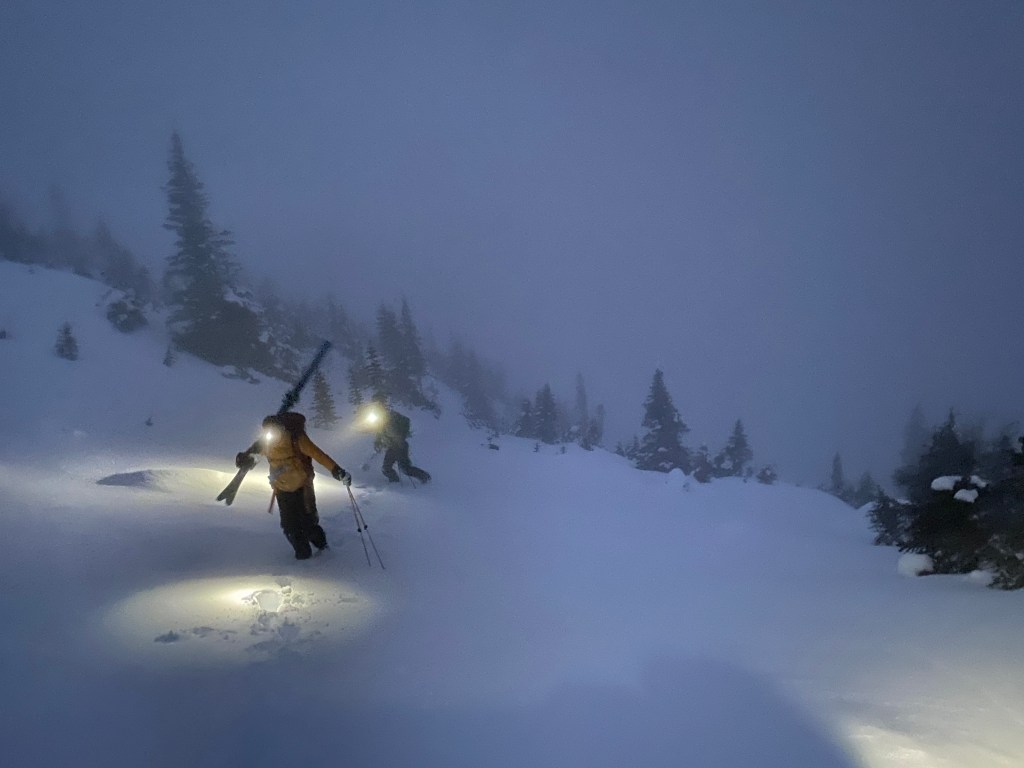 The lake being unfrozed greatly increased the buy in to ski this line. There is no easy way around the lake. The east side offers a long detour and the west side has you navigate through a few awkward rock bulges that make quite slow going. By the time we were back to the trail we had our headlamps out. The descent was a bit of a grind between rocky turns and a slippery steep hike out. Overall a spectacular day, but the early season coverage worked us a little more than expected.