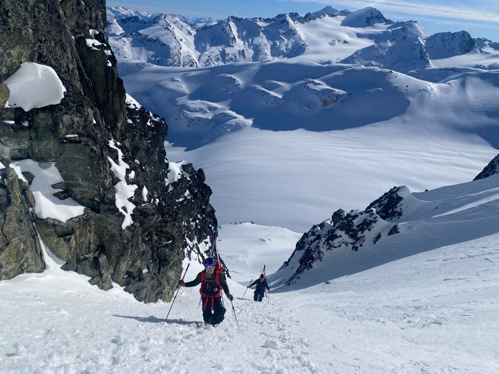 After a short skin and a fun little steep chute above the north end of the spearhead glacier we traversed over to Stairmaster Couloir. We were the second party up and the sun affected crusty snow made for a fast bootpack up.