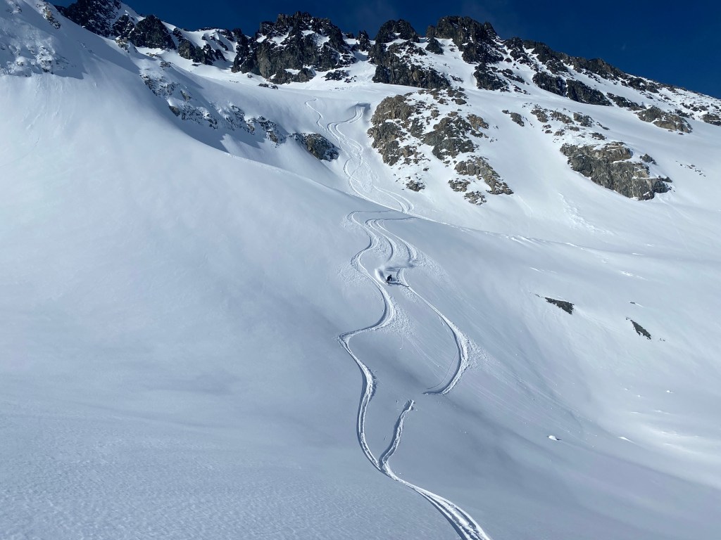 These couloirs get a lot of sun exposure and the snow was variable and crusty. I happened to be on my heavy skis today and it was fun to have the damping and control that they offered through the variable snow. Once we hit the apron, the snow changed for the better. We had beautiful fresh tracks and powder turns down to the Spearhead Glacier.