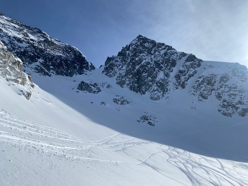 The SE face of Phalanx has a complex web of couloirs weaving through its fractured granite. The line shown below is what is usually called Warrior Couloir and is one of the cleanest lines. But there are many many more alternate lines that can go on Phalanx, and the zone between Stairmaster and Phalanx North is also sometimes described as Warrior Couloirs(plural) to cover the multiple descent options. All the lines are under 200m, but it’s a cool zone and easy to get to from Blackcomb.