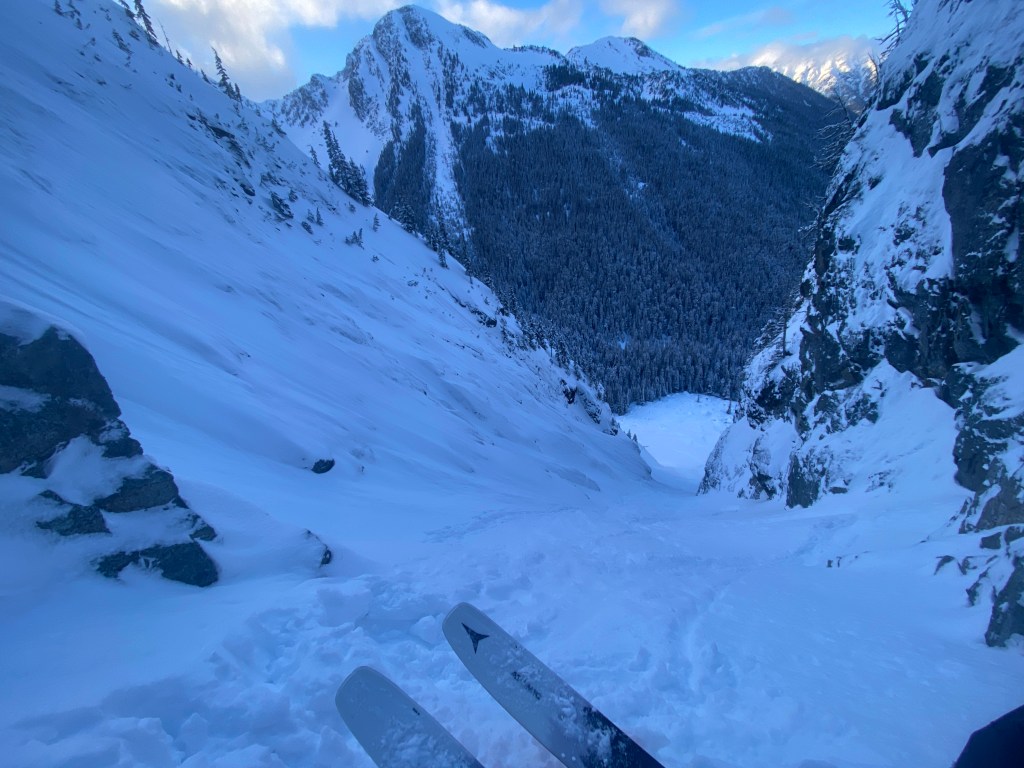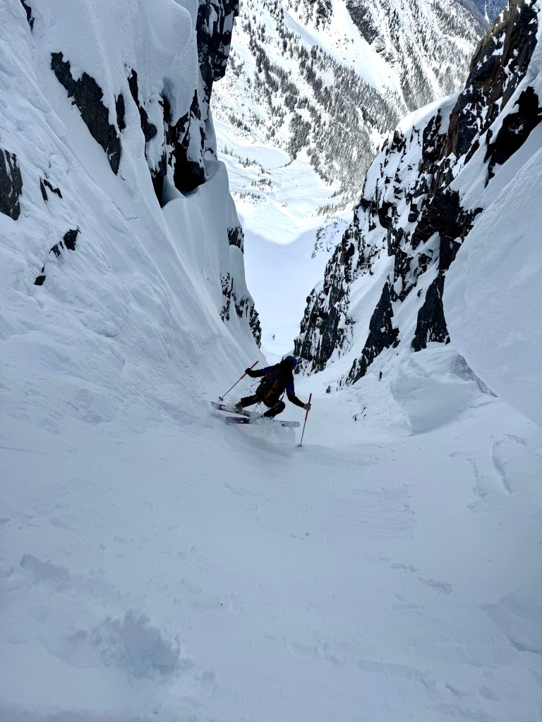 The snow was great in the couloir, it had sluffed out a lot recently. Leaving behind a firm and very edge-able surface. After some jump turns in the upper section of couloir it lead to fantastic dry powder down to the bottom of the bowl.