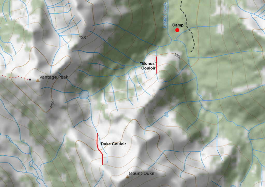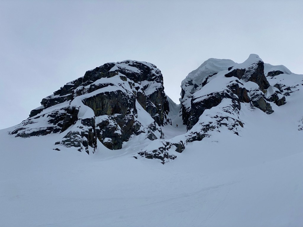 The couloir itself is about 200m long over 150m vertical. After exiting the couloir you enter a beautiful bowl with a fairly sustained slope. From the top of the couloir to the bottom of the bowl is a nice 450m vertical run.