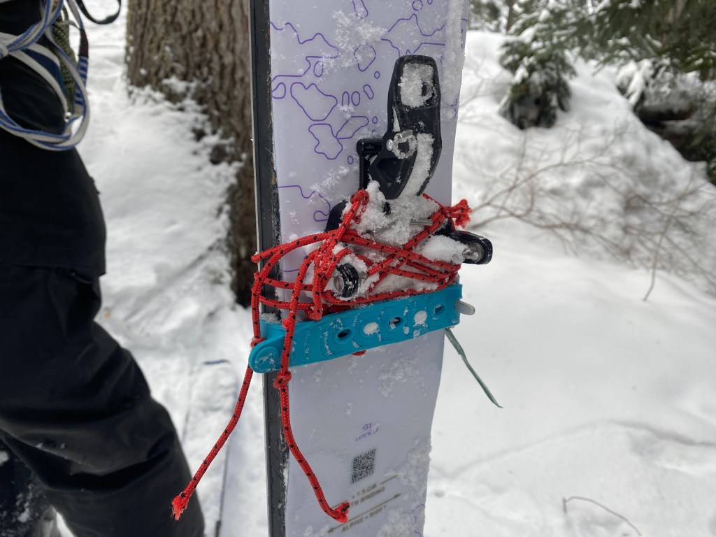 Kynan had much less optimal run down the Couloir. On his first jump turn his skis offered up a loud crack and badly delaminated. The skis had delaminated right under his toe piece and partially pulled out the binding. He cautiously sideslipped down the couloir, not trusting the skis to hold together for a second jump turn. Once we were in a safe spot we reinforced the binding with my ECT cord and ski strap. Skis were a pair of QST echos on only their 9th day skiing. Overall it worked out and Kynan was able to gently ski them back to camp and out to the car.